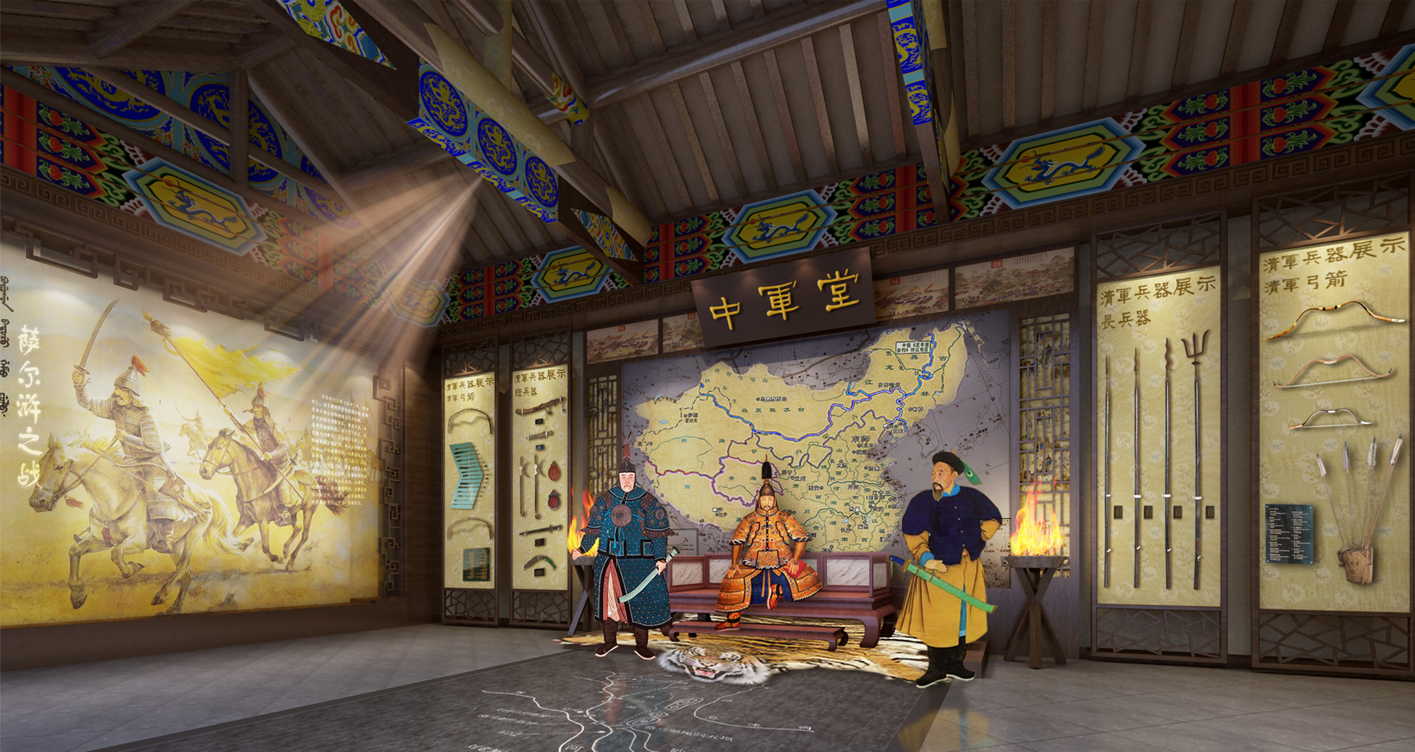 方案設計摒棄原來單一以“展廳”形式為主的流陳,增加了多處場景還原,真實再現當年八旗子弟生活工作的場面。此案在設計上巧妙的把滿族文化融入到生活場景中,如“滿族萬字坑”“清代閨房”“神桿”等,再輔以古色古香的墻面石刻與展柜,在有限的空間內盡可能完整全面的呈現八旗文化。