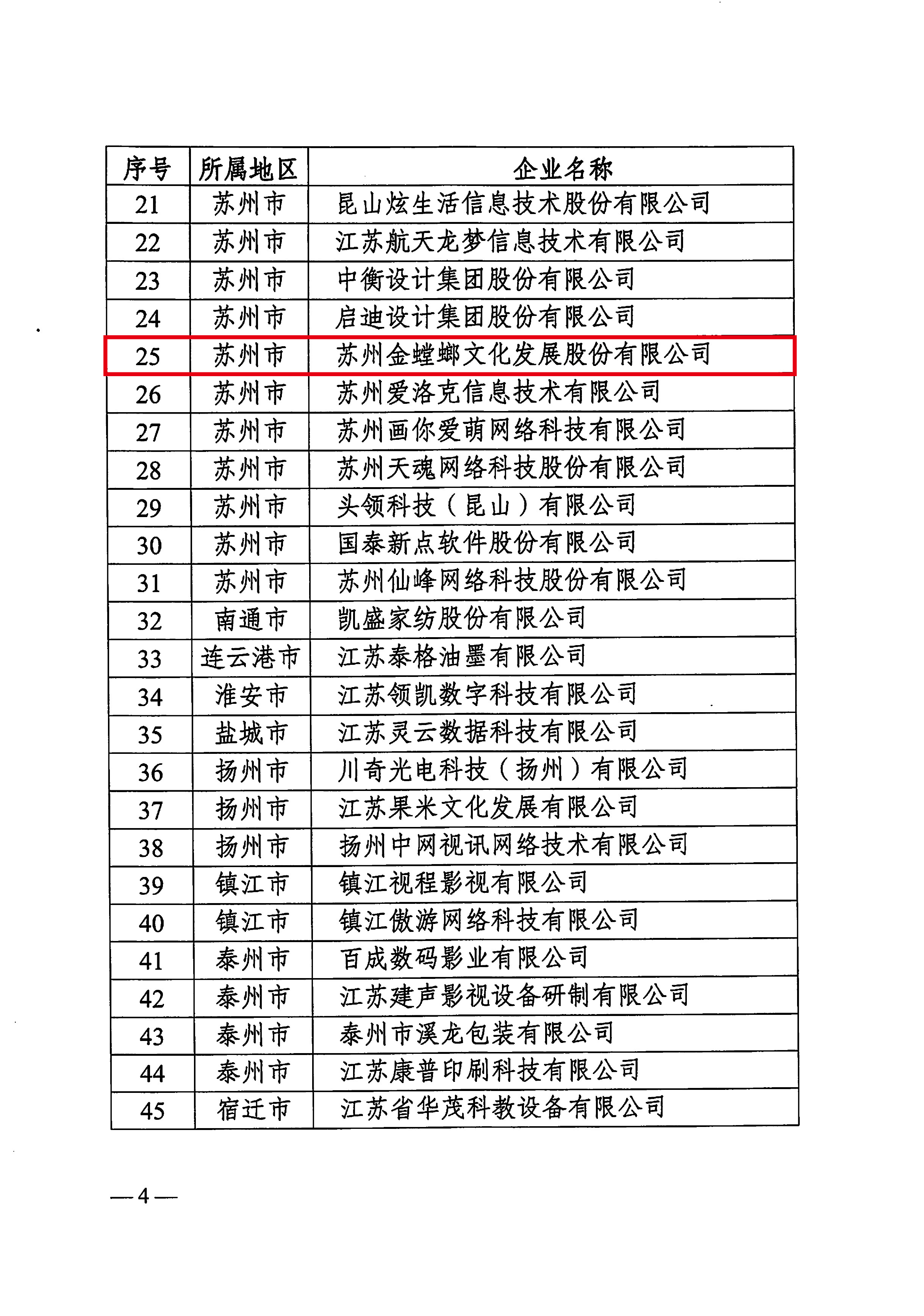 中共江蘇省委宣傳部、江蘇省科學(xué)技術(shù)廳、中共江蘇省委網(wǎng)絡(luò)安全和信息化委員會(huì)辦公室、江蘇省文化和旅游廳、江蘇省廣播電視局聯(lián)合發(fā)布了“關(guān)于認(rèn)定2020年度江蘇省重點(diǎn)文化科技企業(yè)的通知”,金螳螂文化公司榜上有名 。